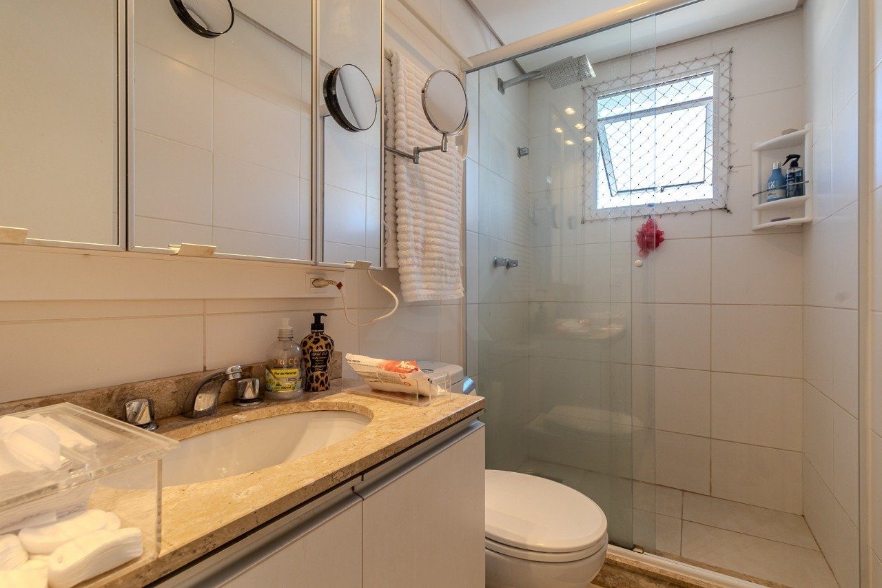 São 2 dormitórios, sendo uma suíte, 3 banheiros e 2 vagas.