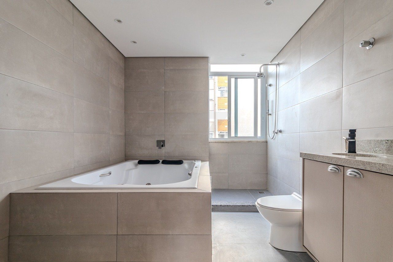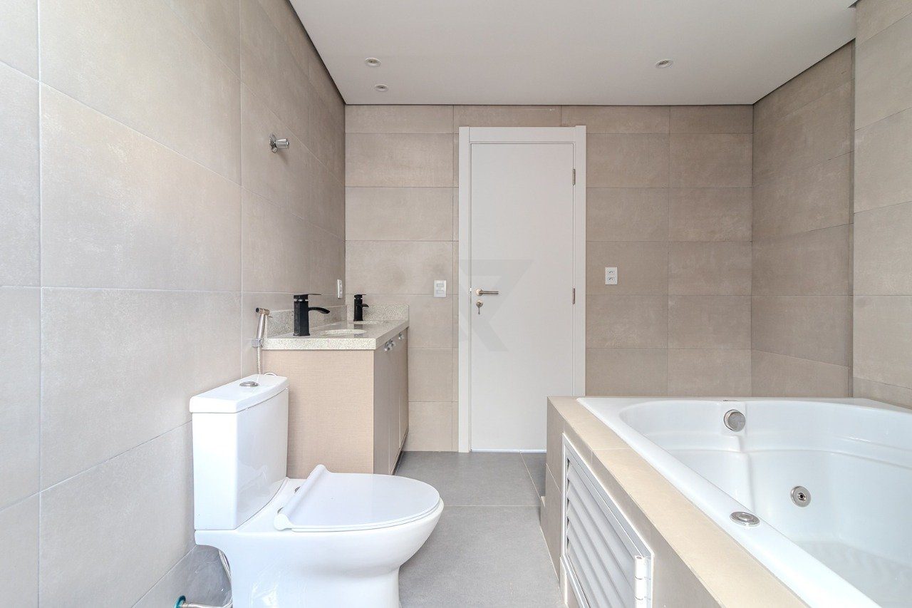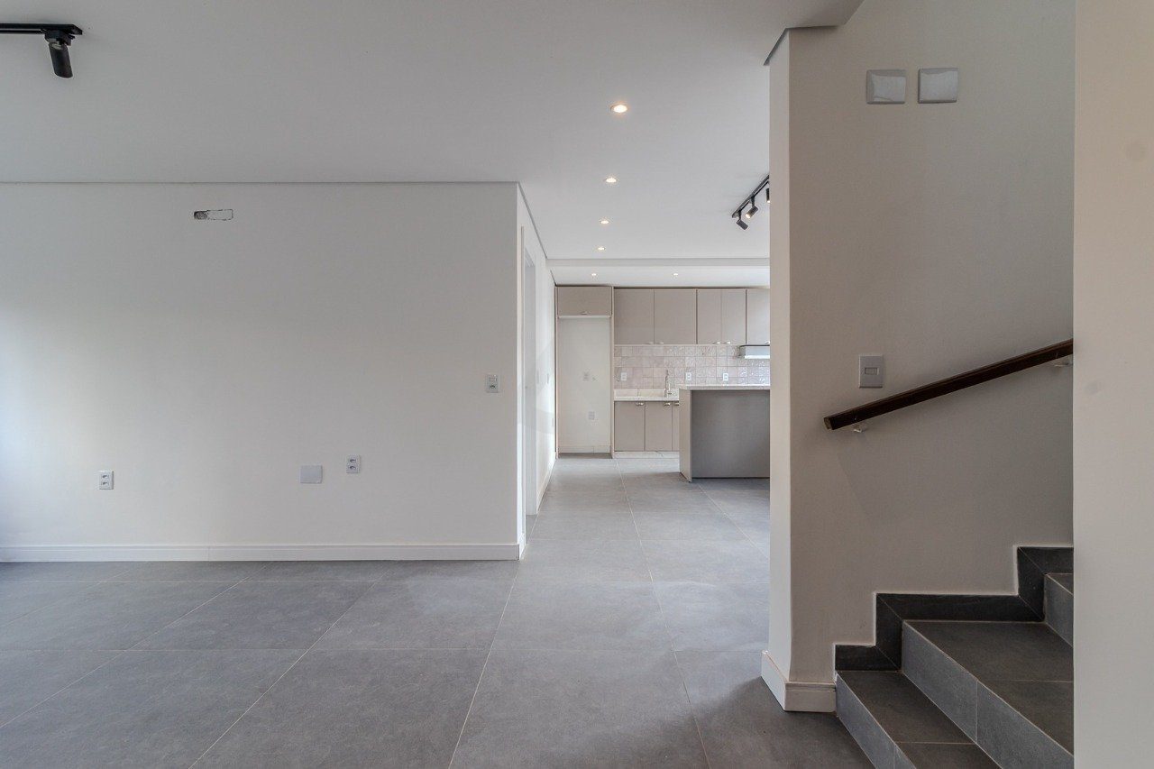 No andar inferior, estão a cozinha com balcão integrado, a sala de estar e três dormitórios, sendo duas suítes. A suíte principal conta com banheira de hidromassagem para duas pessoas, ideal para momentos de relaxamento.