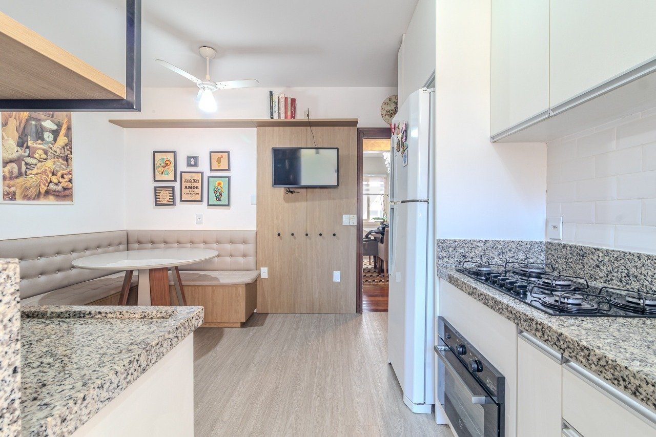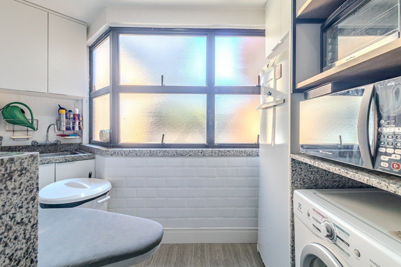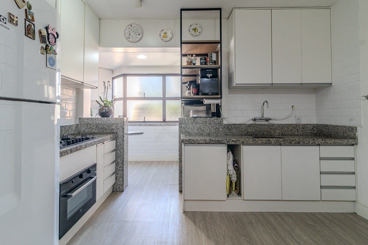 A cozinha é espaçosa, com mesa e área de serviço independente, além de dormitório de empregada com banheiro.